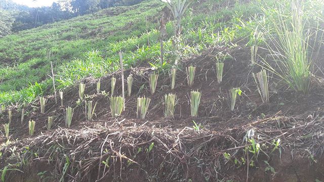On the above photos you can see how Vetiver grass was implemented within the terracing. On a large scale. Transplanted mostly within depleted orange clay soil. We transplanted vetiver within existing tropical fruit crops such as Soursop and it has enhanced the productivity of the crops.