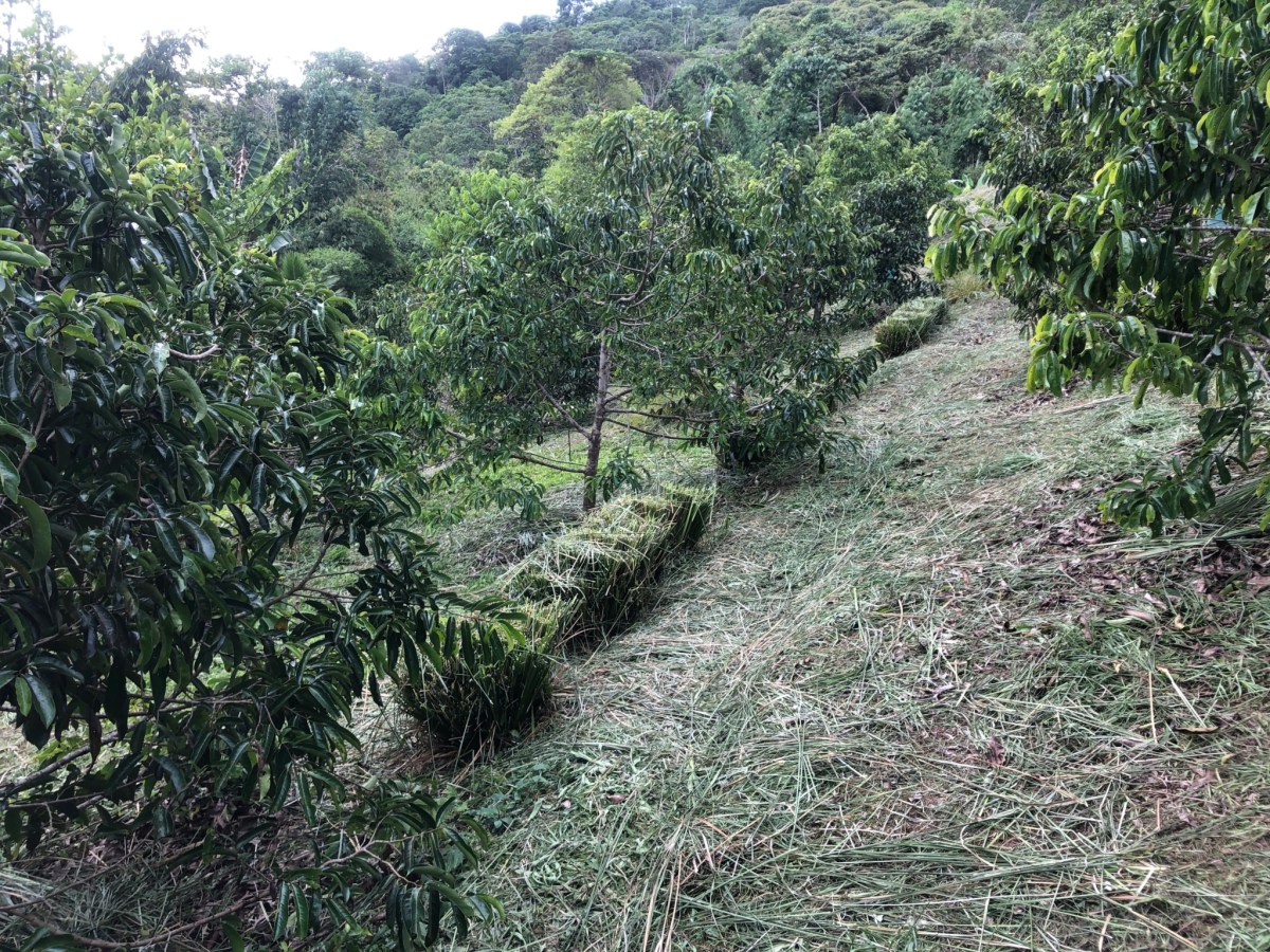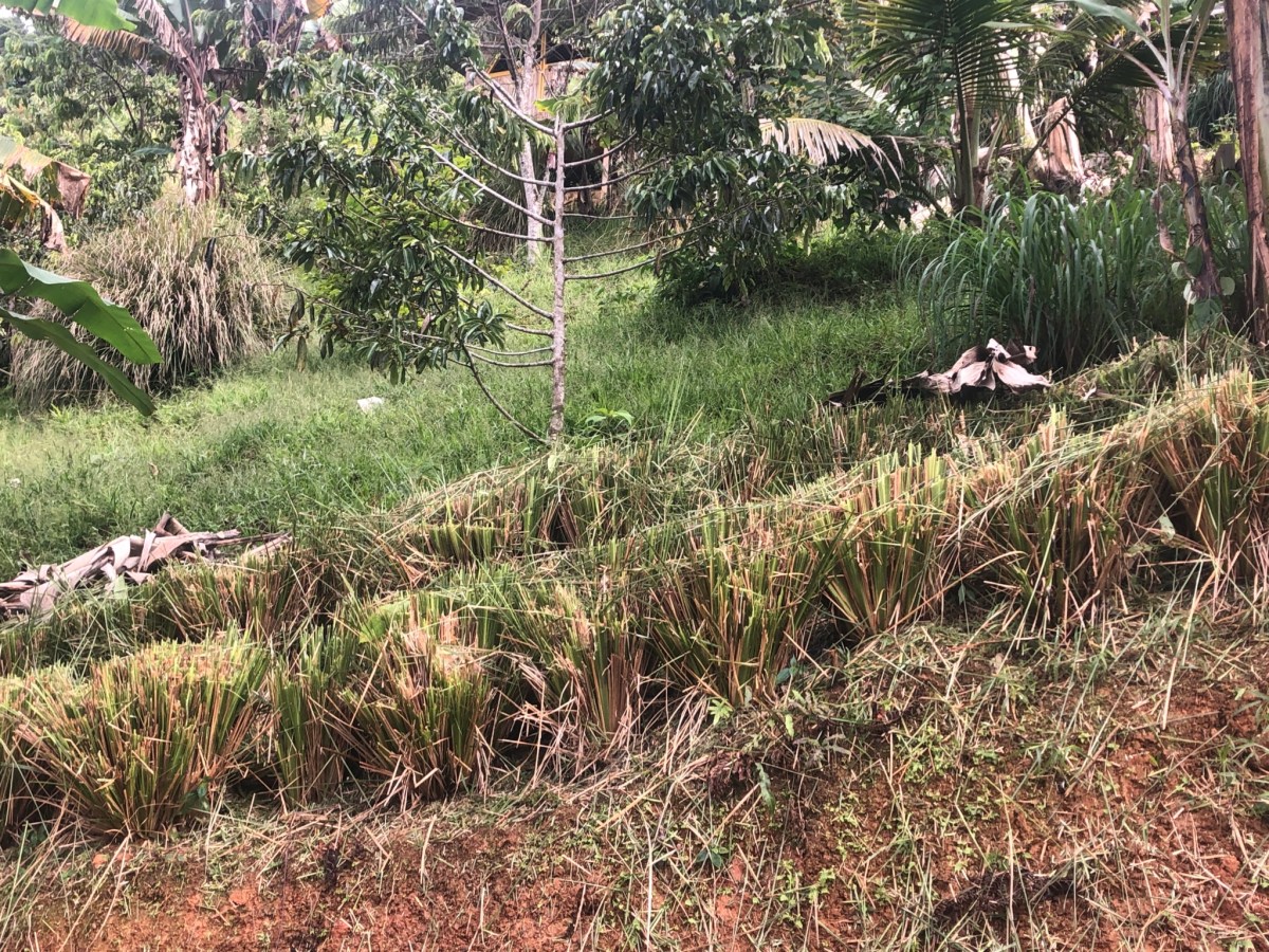 Pruning of vetiver fences up to a height of 30 to 50 cm. Makes them thicker and consequently more effective in filtering runoff water and erosion.
