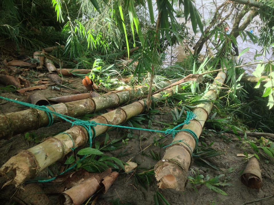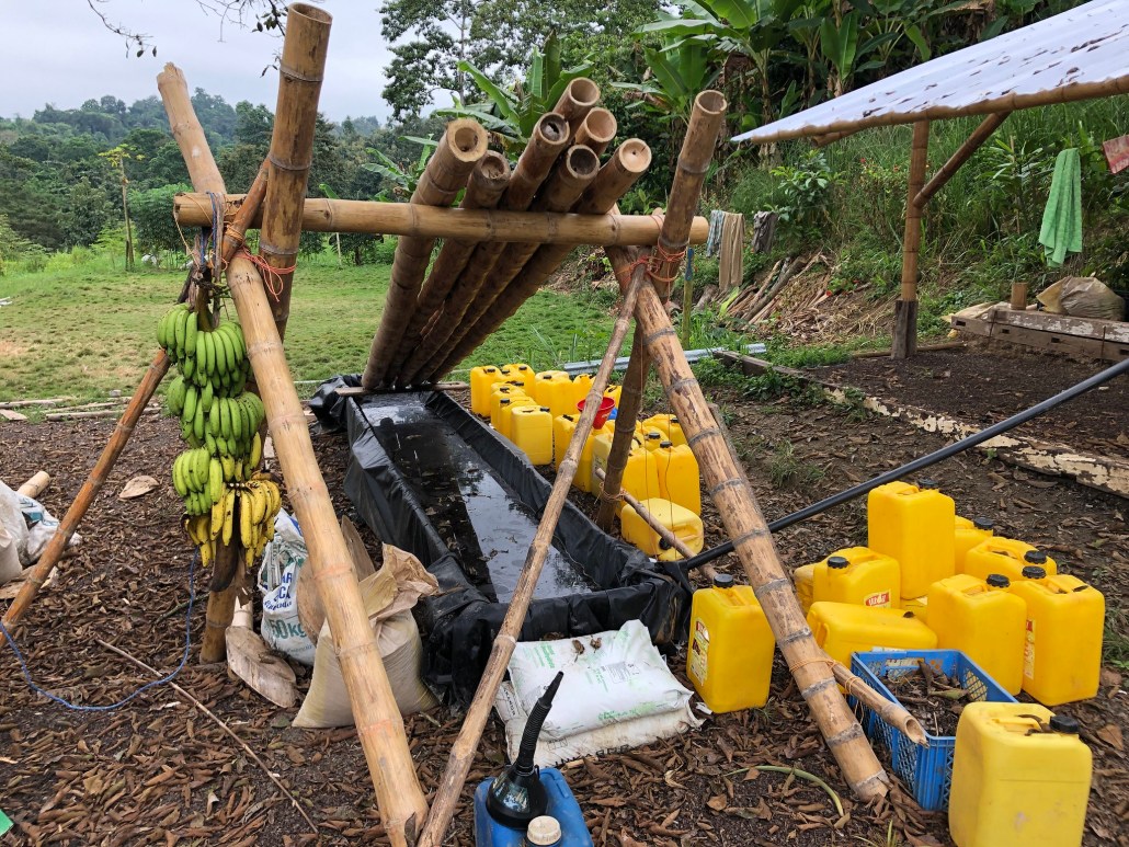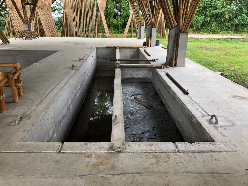In this process, the bamboo is immersed in water. For a period of 6 weeks the weight above keeps them below water level. This process increases the stability of the bamboo, according to local estimates, by 10 years. Starch dissolves in water and by adding the starch it melts.